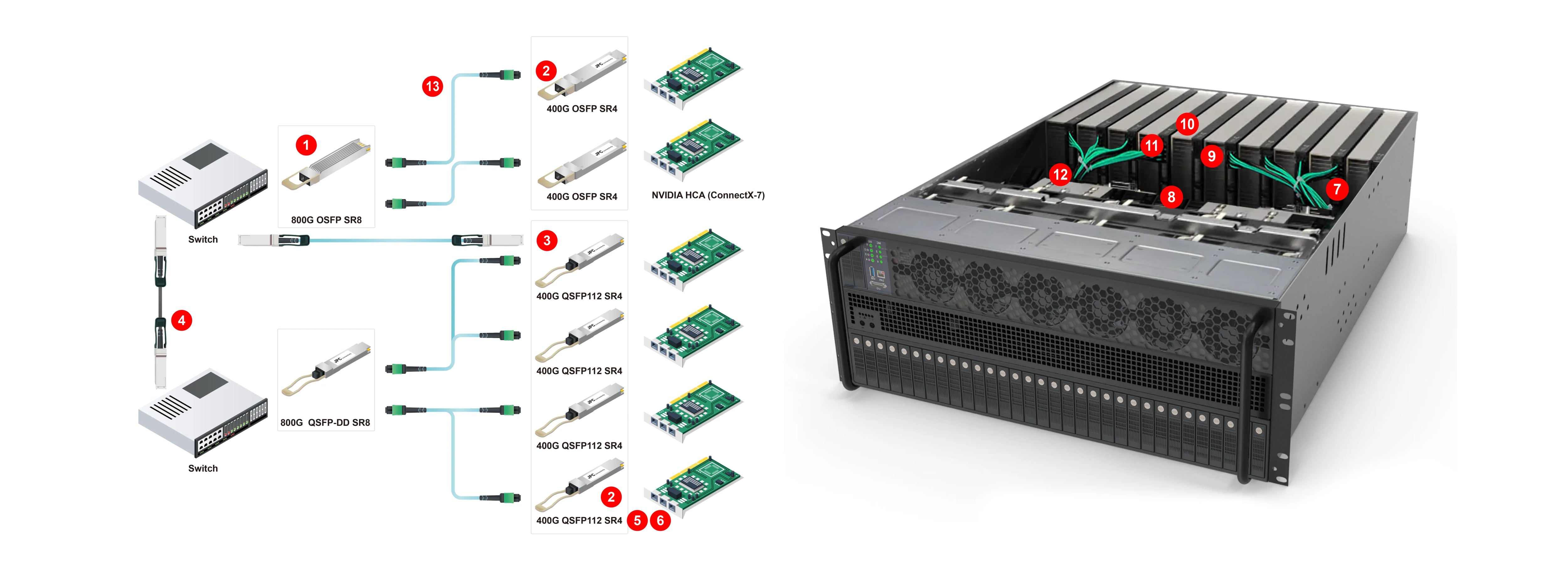 Empower your AI and GPU servers with our high-speed cables and transceivers. Designed for maximum bandwidth, our products ensure seamless data flow, faster processing, reduced latency, and enhanced performance.